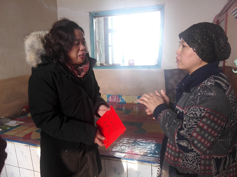 1月17日起,市妇联党组书记兰峰带队,分5个组走访慰问尚志、延寿、五常等6个区县(市)的“两癌”患病妇女家庭和贫困家庭,为87名“两癌”患病妇女每人送去1万元的救助金、为10户贫困家庭每户送去1000元慰问金和价值900元的日常生活用品,让贫困妇女家庭过上一个快乐、和谐的春节。
