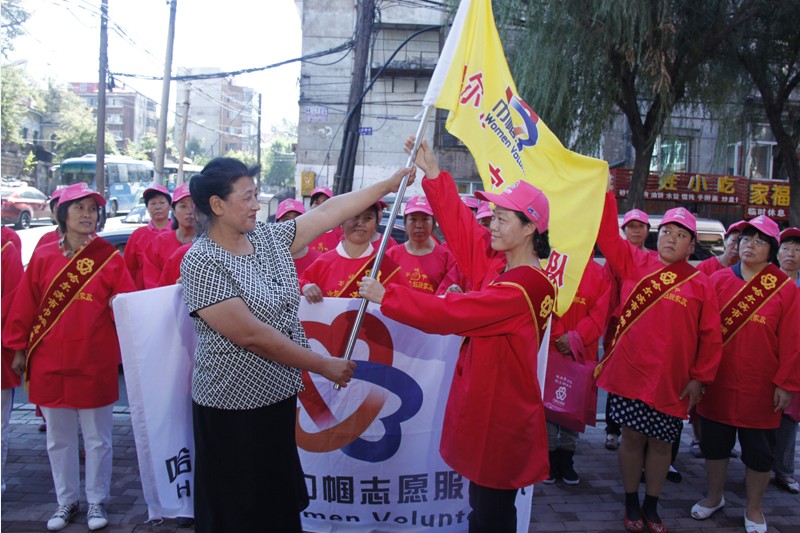 市妇联家政服务中心主任景平为家政志愿者服务队授旗