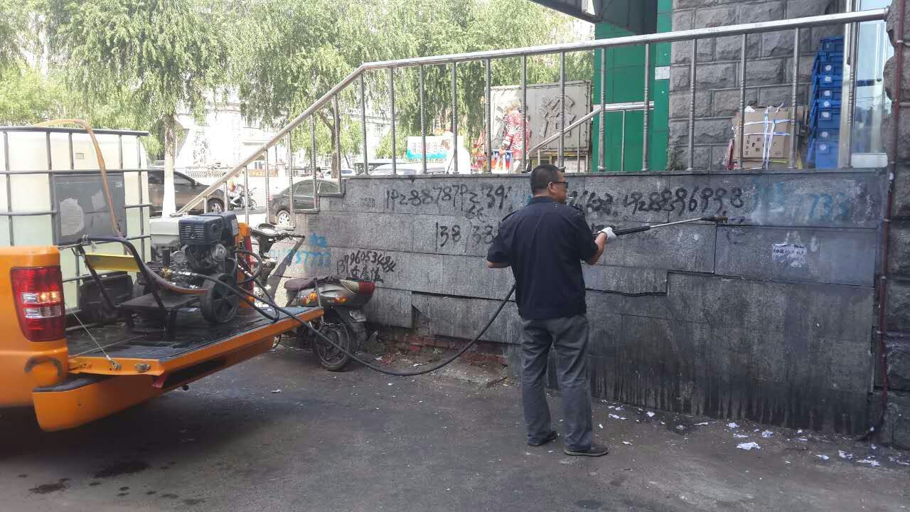 二是加大管护力度。出动4台巡查电动车,3台作业车,早6晚5三时段对东直路、红旗大街、南极街、靖宇街、承德街等商圈周边街路进行全方位的巡回管控,并利用高压水枪对蒙尘光滑墙面的墙体进行冲洗,提升墙体的洁净度。
