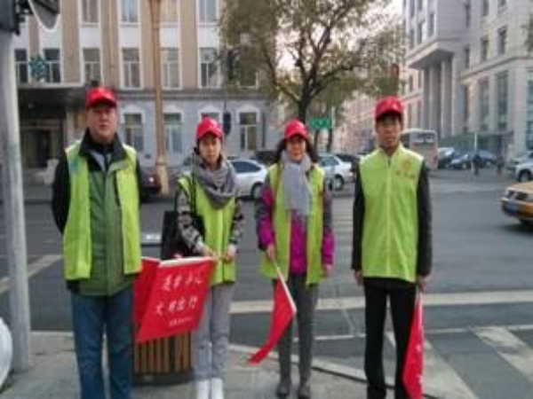 为了使哈尔滨市的交通秩序井然有序,市民自觉遵守交通规则,倡导行人过街走斑马线,不乱闯红灯。社区组织志愿者在早晚上下班的高峰期间,到人员密集的地段街与柳树街交口,引导过街市民自觉走人行斑马线,不闯红灯。对闯红灯的市民给予劝阻,告诫他们要自觉遵守交通规则。