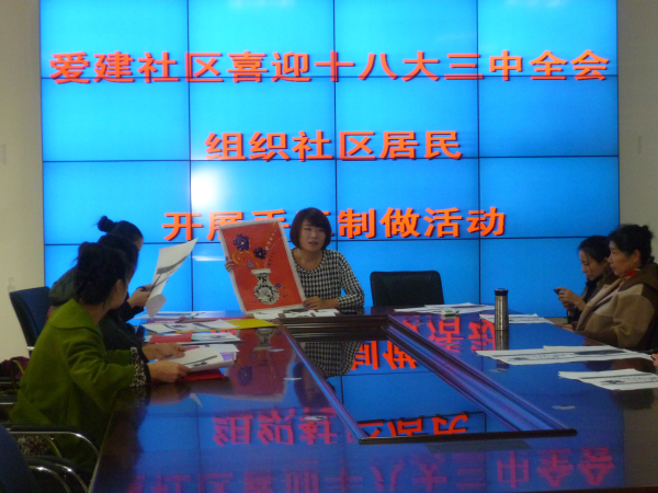 哈尔滨广播电视大学的姜老师不到9点就来到了社区,居民朋友们从自家带来了碎花布、剪刀、卡纸、胶带等制作材料,姜老师讲的认真,边讲边辅导,居民们听的用心,边听边做,姜老师对每个做品都耐心指导,居民们心灵手巧,用自己的巧手绘制粘贴出布艺手工制品,最后近20幅作品展现在人们面前。居民朋友说:“在党的十八大三中全会召开之际,我们将亲手做的布艺工艺品在楼道里展出非常温馨”。这次活动后,爱建社区将布艺工艺品在廉政楼道里悬挂,让大家欣赏居民自己亲手做的手工工艺品。
