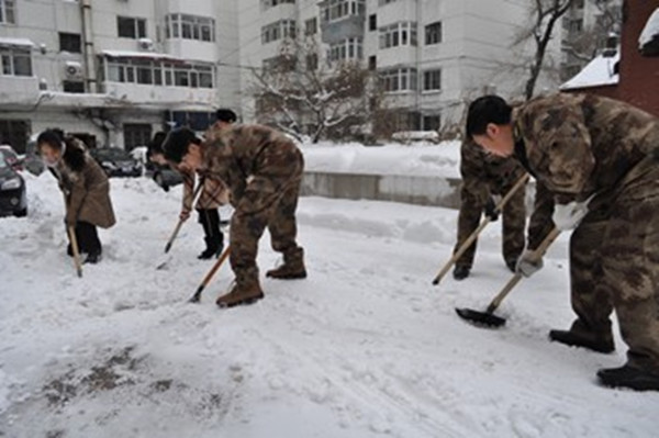 这里有一支真正的战斗队伍,他们就是南岗区武装部的官兵们,天气虽然很冷,但是他们干得热火朝天,衣服让汗水浸湿了,官兵们都脱掉外套,风风火火的清理冰雪,一会的功夫,雪就清到道边上。此次降雪量大,积雪很深很厚,短时间内不可能全部清理干净,官兵们就给居民打出雪道,便于居民的出行。