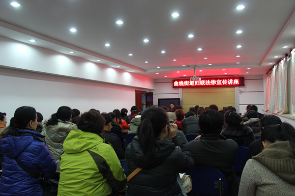 曲线街道妇联牢牢把握12·4日全国普法日的契机,2013年12月3日上午,曲线街道妇联主席邸魏红走上讲台,为机关、社区妇女干部,流动、留守妇女,巾帼志愿者们作了一场法律宣传讲座,为姐妹们深度讲解如何防止家庭暴力。