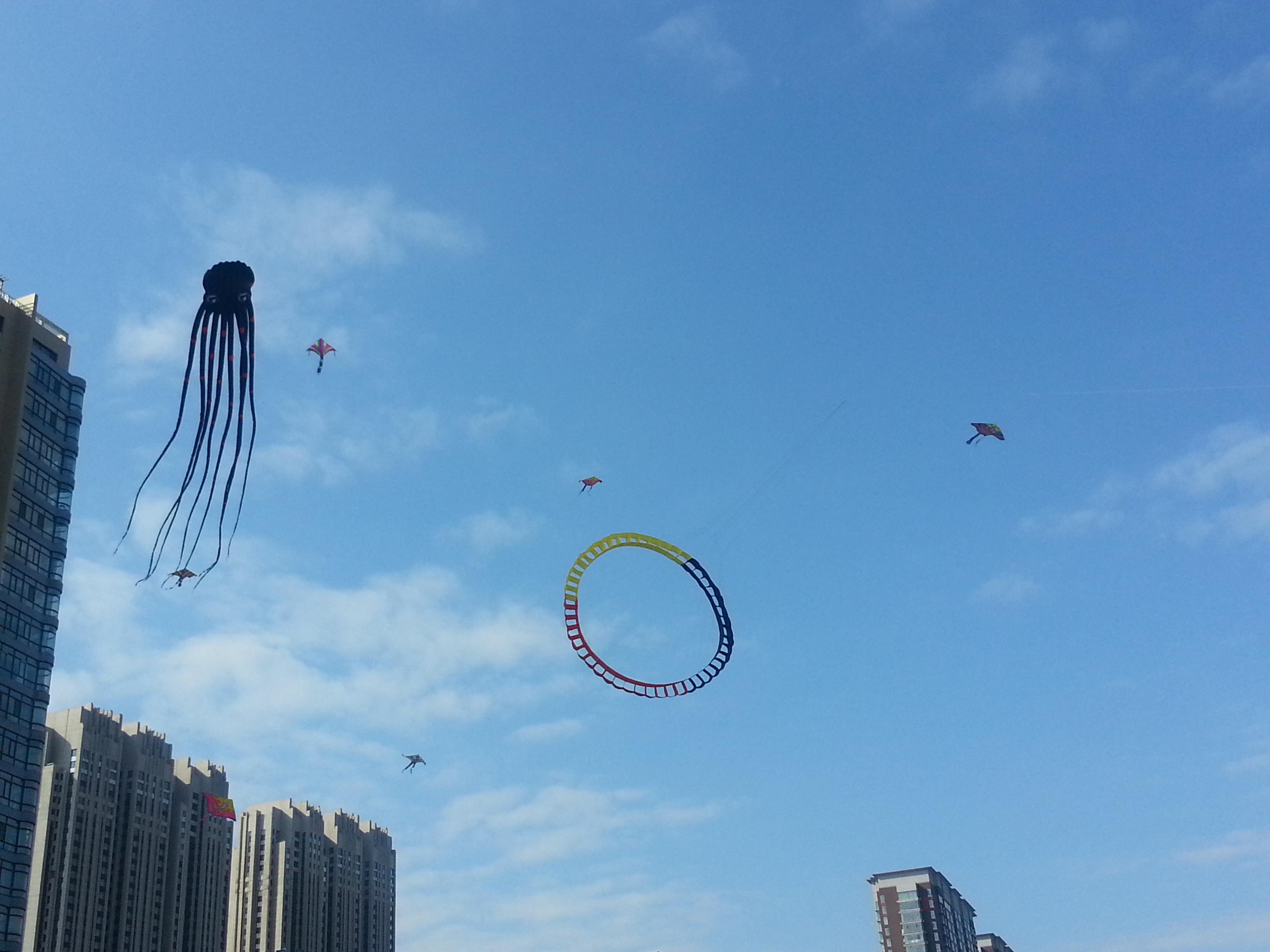 上午9点整,人们来到道外区闯关东广场,只见各种各样的风筝,在风筝好手的放飞下,都飘然升空。五颜六色、各式各样、做工独特的风筝在蔚蓝色的天空中尽情飞舞,一条长约十多米的“章鱼”型风筝,十分引人注目,它的身体细而长,飞得最高,让人看了这威武的样子就感到无比的羡慕。