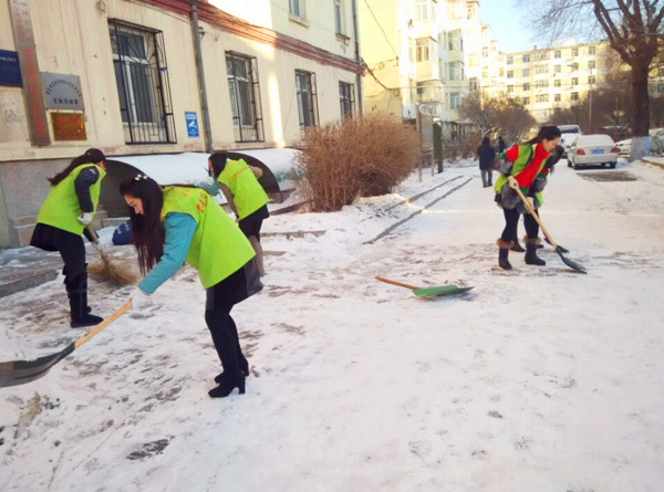 为此,于12月27日一早,社区妇联主席孙文涛、孙伟华主任带领辖区妇女、社区干部及大学生志愿服务队的20余人提前一小时来到社区,进行集中清理冰雪活动。虽然寒风凛冽,气温零下18度,但大家的劳动热情高涨。他们手握扫把铁锹,用力的将积雪堆到路两旁。在一片欢声笑语中,经过两个多小时的努力,把积雪清扫的干干净净。