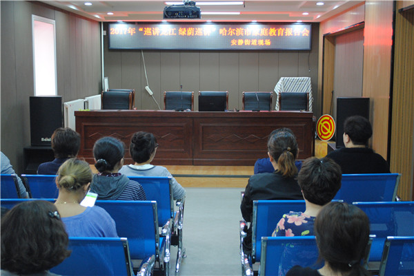 5月3日下午,道里区安静街道妇联组织辖区妇联干部、巾帼志愿者代表、居民观看2017年“巡讲龙江 绿荫巡讲”哈尔滨市家庭教育报告会。