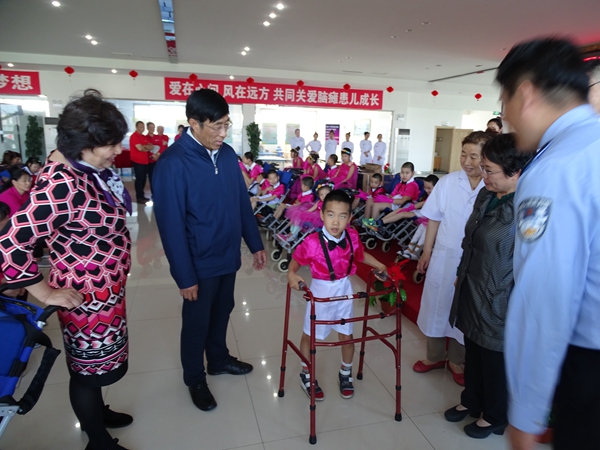 博能康复中医院成立以来,得到平房区委区政府的大力支持,医院的发展和孩子的康复情况也一直牵动着区委区政府领导们的心,这次“六一”儿童节,区委刘书记亲自将20台助行器交到孩子们手中,受到家长和孩子们的热烈欢迎。博能脑瘫康复中医院自成立以来,短短的三个月时间,已经免费收治脑瘫儿童70多名,孩子们从最初的不会走,不会说话,到现在的能走几步,能说几个字,有了喜人的变化。领导们观看了孩子们的手语表演,并走到孩子们中间与孩子们亲切的交谈,10岁的杜浩明,看到这么多人来看望他们,高兴的为大家背起了苏轼的《水调歌头·明月几时有》看着杜浩明那可爱的小模样,刘书记亲切的牵起他的小手,并和他一同背了起来。看着孩子们取得的点滴进步,看着家长们脸上洋溢的微笑,大家都感到由衷的欣慰。