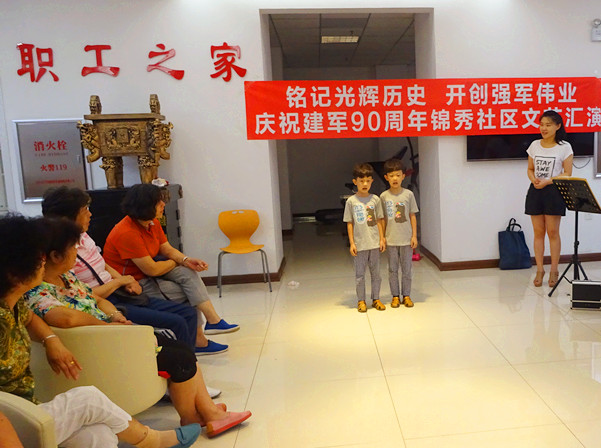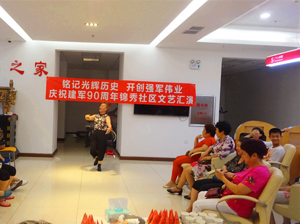 为庆祝建军90周年,近日,大成街道锦秀社区妇联与驻街单位中信银行联合开展主题为 “铭记光辉历史 开创强军伟业”文艺汇演。恰逢征兵工作的开始,同时在活动中大力弘扬优良传统、军民国防意识、营造军民团结的良好氛围,促进社区军民的邻里交流,共建和谐、温馨的社区。