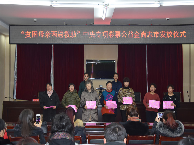 1月30日上午,哈市妇联副主席王丹及尚志市妇联一行为尚志镇1名患病妇女入户发放了1万元救助金。1月30日下午,尚志市妇联举行了“贫困母亲两癌救助”中央专项彩票公益金发放仪式,现场为7名农村贫困“两癌”患病妇女发放了每人1万元的救助金,受救助农村贫困“两癌”患病妇女、各乡镇妇联主席参加了发放仪式。