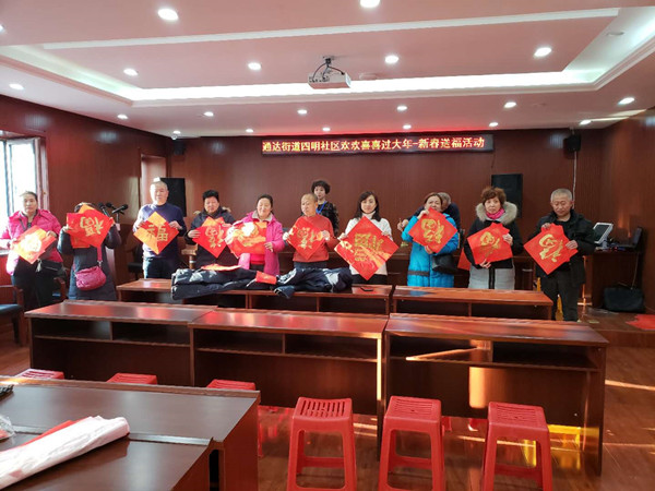 “过大年,贴春联”一直是表达人们向往美好生活的传统文化,为弘扬这一传统文化,丰富群众的文化生活,在春节来临之际,通达街道四明社区妇联邀请辖区书法爱好者在社区开展迎新春、写对联、送祝福“欢天喜地过大年”志愿服务活动。