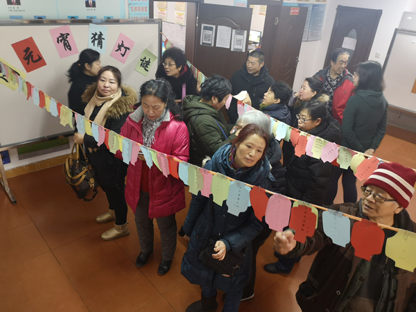 活动开始前,妇联工作人员及巾帼志愿者将精心准备好的100多条谜语高高悬挂在活动室的绳子上,不仅有大家喜闻乐见的字谜,还有许多猜成语、猜动植物和歇后语等等。来参与的居民、青少年有的与身旁的朋友“窃窃私语”,有的自己在手里不停地比划、沉思。猜对答案多的居民欢欢喜喜地领取了社区准备的一份小礼品,现场洋溢着欢乐、祥和、喜庆的气氛。