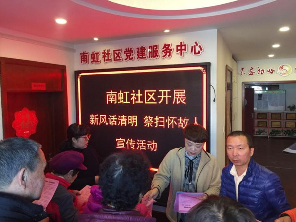 南虹社区通过悬挂条幅,设立宣传板让过往的居民都驻足观看,社区工作人员积极向居民发放“倡导文明祭祀、共护美好家园倡议书”,号召广大居民清明期间不要放鞭炮、焚香烧纸,向居民说明这些祭祀陋习不仅污染环境,还会带来火灾隐患,提倡居民们用鲜花祭祀、清扫墓碑、颂读祭文等健康时尚的祭祀方式寄托对故人的哀思。社区号召广大党员和社区干部要以身作则,做文明祭祀的带头人,并充分利用宣传栏、电子屏、宣传横幅等载体弘扬祭祀活动的文明新风,让文明祭祀的观念深入人心,蔚然成风。